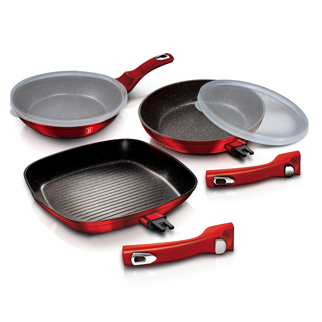 Σετ 2 τηγάνια και γκριλιέρα – σχαροτήγανο με αντικολλητική επίστρωση μαρμάρου, πλαστικά καπάκια και 2 αποσπώμενες λαβές Metallic Line Burgundy Collection Berlinger Haus BH-6796